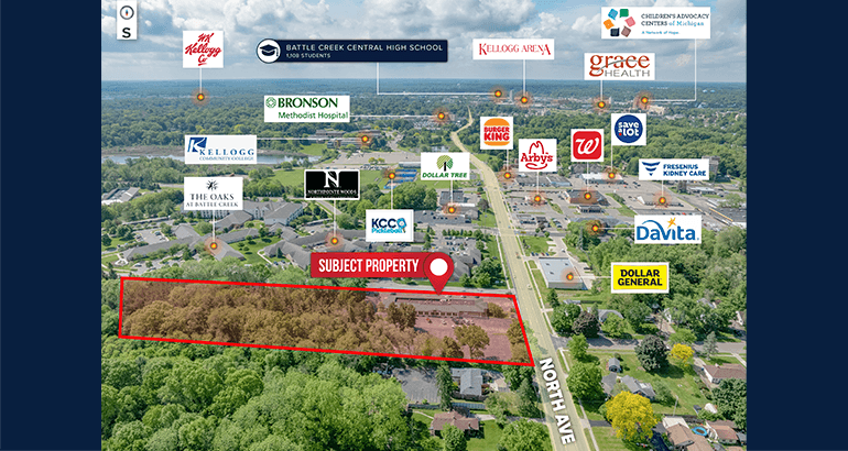 MEDICAL CORRIDOR WITH ACCESS TO MAJOR HIGHWAYS – North Avenue boasts over 11,200 vehicles per day and is in close proximity to I-94 and M-66. This area has a strong medical presence and is less than a mile from Bronson Hospital, Grace Health, and Kellogg Community College.