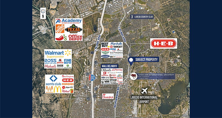- The site is just down the street from a major intersection at McPherson Rd and E Del Mar Blvd which includes a major HEB shopping center and other national tenants like Starbucks, McDonald’s, Smoothie King, Crumbl, Walgreens, Chipotle, 7-Eleven KFC, Jiffy Lube, etc., all which constant traffic to the location.