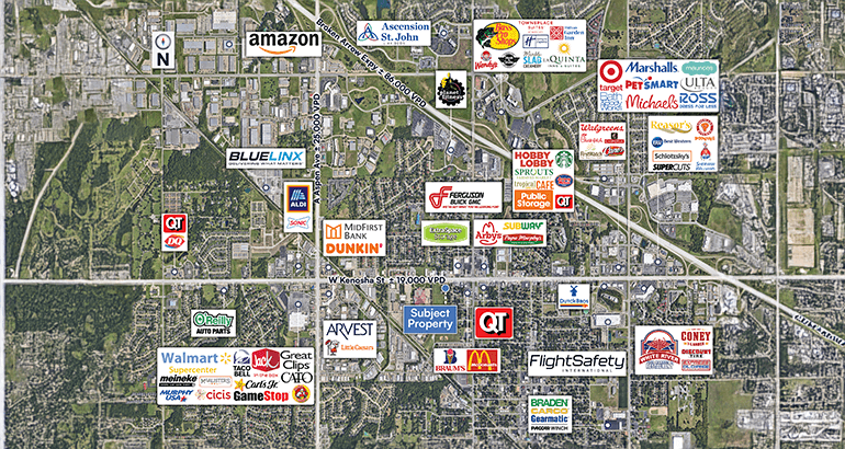 Tulsa, Oklahoma MSA | Fast growing suburb | Robust demographics | Proximity to national retail: There are over 175,000+ residents in a 5 mile radius of the property, with average household incomes above $90K. The location is well positioned on Kenosha St, seeing over 25K VPD, and down the street from major retail corridors featuring national tenants like Walmart, ALDI, BestBuy, Sam’s Club, Target, Marshall’s, Ross, Dick’s Sporting Goods, Reasor’s Grocer, Lowe’s, etc.