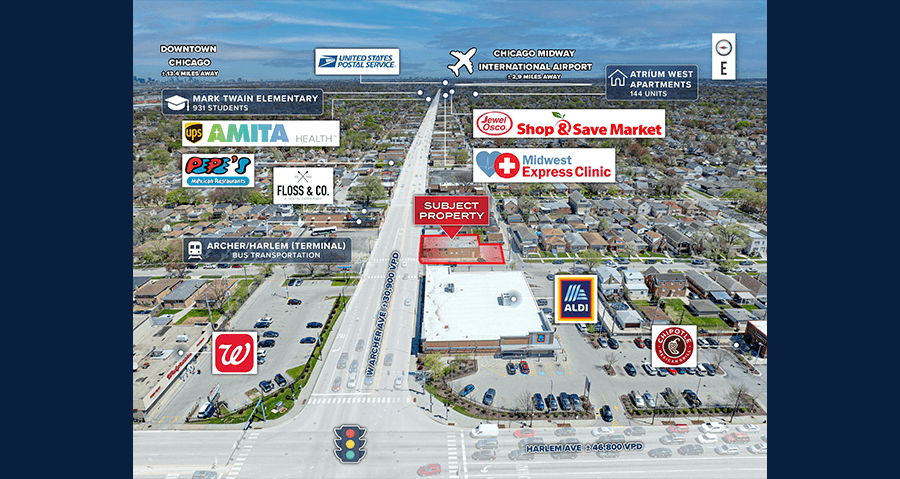 PRIME LOCATION WITH HIGH VISIBILITY – Strategically located on Archer Avenue (±30,900 VPD) and directly off of Harlem Avenue (±46,800), this property offers easy access to major transportation routes, including I-55, and is just minutes from Midway International Airport. Additionally, the site is within close proximity to top-tier healthcare facilities, including Advocate Christ Medical Center and Loyola University Medical Center.