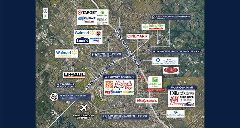 - The Holiday Inn & Suites benefits from a highly strategic location directly adjacent to Post Oak Mall, which draws approximately 3.3 million visitors annually— averaging around 275,000 visits per month. The property is also situated just minutes from Texas A&M University, one of the largest public universities in the nation, and Kyle Field, one of the largest collegiate football stadiums in the country. With a five-minute drive to campus and a seven-minute drive to the stadium, the hotel is ideally positioned to capture both leisure and business demand from university events, athletic competitions, and corporate visitors associated with mall retail operations.