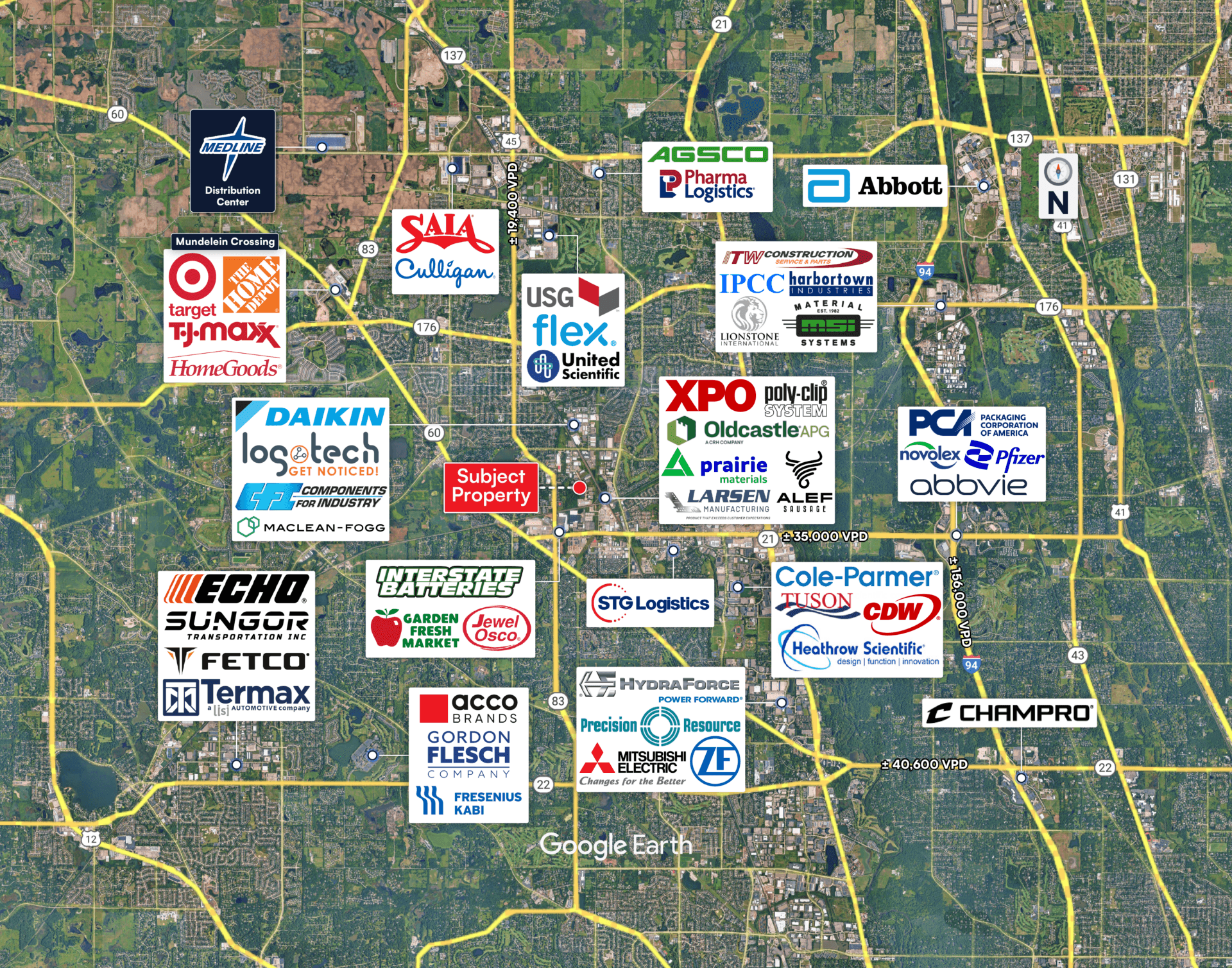 Located in the established Chicago suburb of Mundelein, the property benefits from strong surrounding demographics, with over ±118,000 residents within a five mile radius. The area offers access to a skilled labor pool, above average household incomes, and a diverse economic base that supports sustained demand for industrial space.