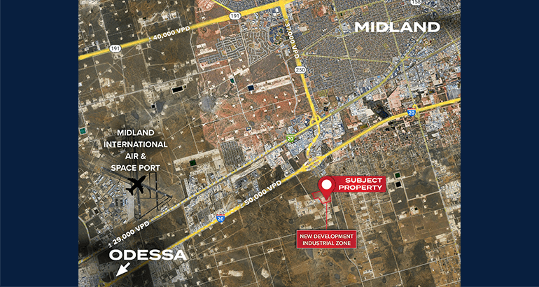 Strategic Permian Basin Location – The subject property is strategically located just off Interstate-20 (I-20), a major east-west interstate connecting from Interstate 10 (I-10) in Midland/Odessa to key energy and industrial markets such as Dallas, Atlanta, and beyond, as well as lies just ±4 miles from Midland International Airport – offering direct access to the broader Permian Basin. As the epicenter of America’s most productive oil formation, Midland/Odessa serves as a vital hub for oilfield operations, providing unmatched access to drilling activity, skilled labor, and energy infrastructure. Additionally, the South County Road 1232 corridor is experiencing a surge in new industrial development and absorption due to significant infrastructure investment, including Loop 250 extensions and upgraded intersections.