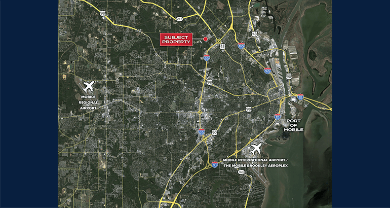Strategic interstate access – Positioned directly along Interstate 65 (I-65) and in close proximity to Interstate 10 (I-10), the property offers exceptional access to two of the nation’s most critical freight corridors. I-65 serves as a major north-south route connecting Mobile to Chicago and the Midwest, while I-10 spans over 2,460 miles across key southern states from California to Florida. This strategic location also provides quick connectivity to regional transportation hubs, including the Brookley Aeroplex and Mobile International Airport.