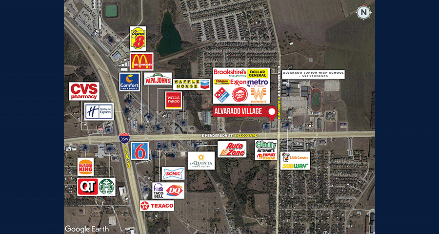 • Hard Corner: Located on the NW corner of N Cummings Dr and E Henderson St, a major thoroughfare in Alvarado