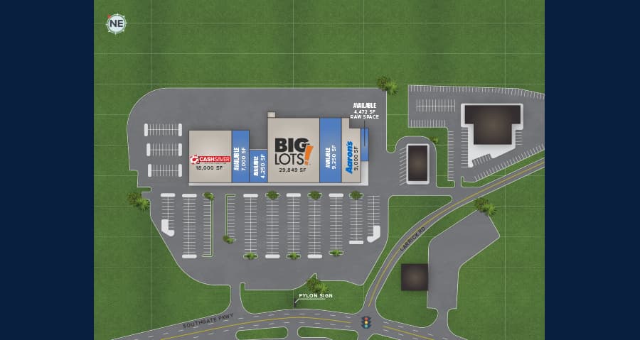 Located on Southgate Parkway with ideal pylon signage opportunity.