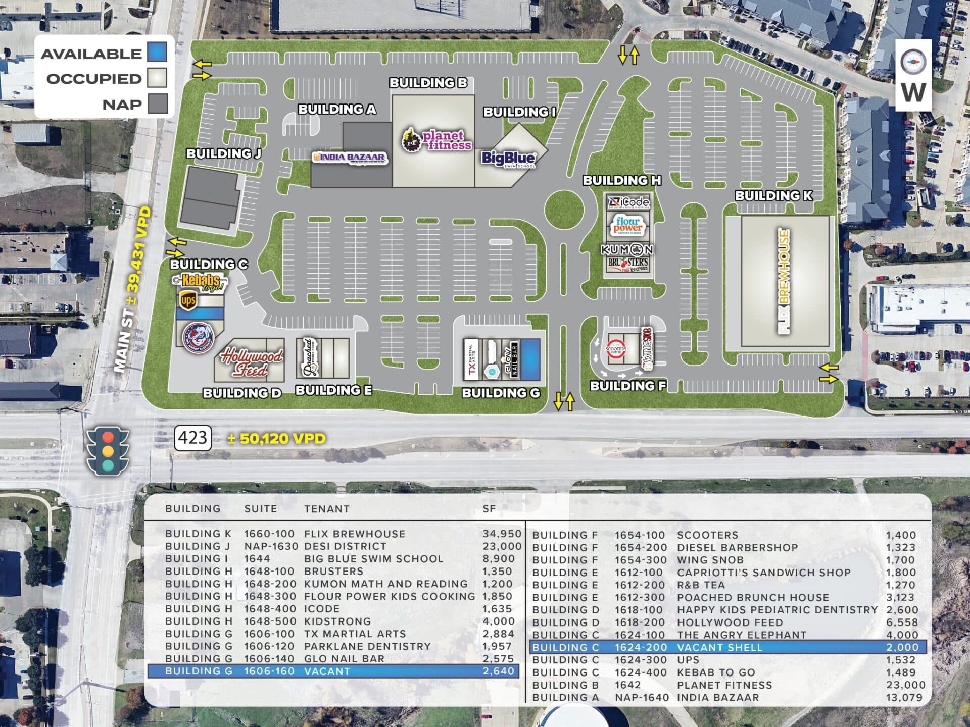 The Shopping Center accommodates 5.77 parking spaces per ±1,000 SF & features 5 points of ingress/egress along FM 423 & Main St