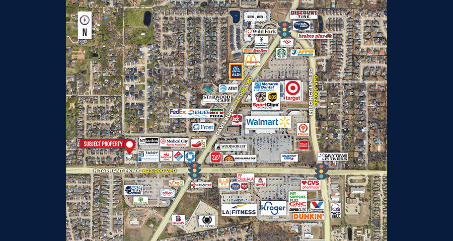Direct access and visibility to the highly traveled N Tarrant Pkwy; left turning lane accessible with superior ingress/egress