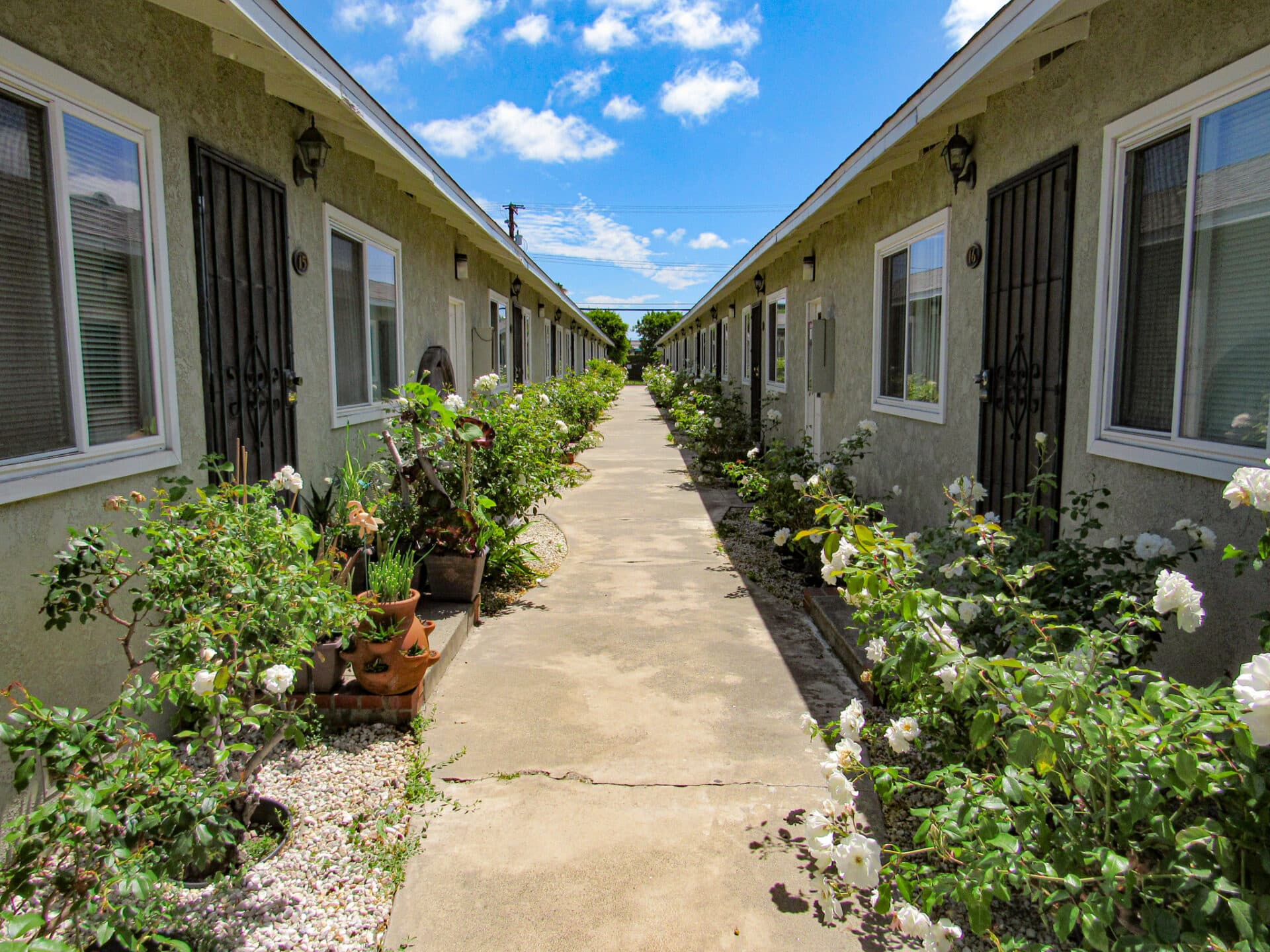 • Beautifully landscaped with white rose bushes, courtyard fountains, and gated pedestrian access on both ends.