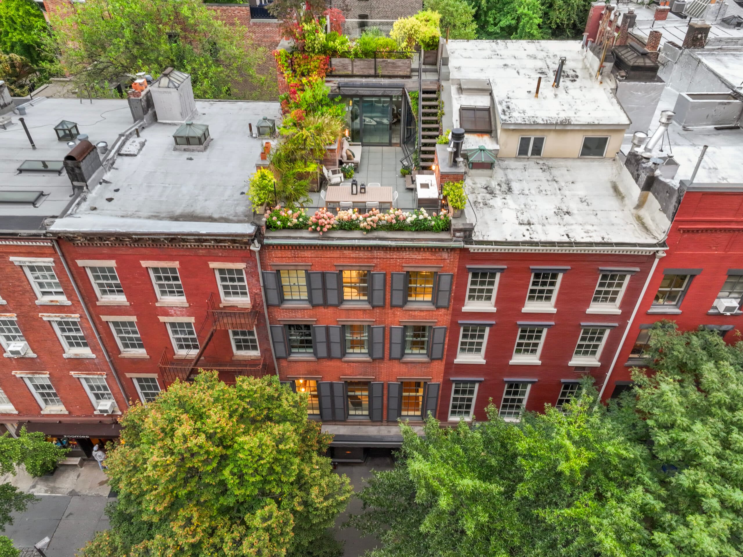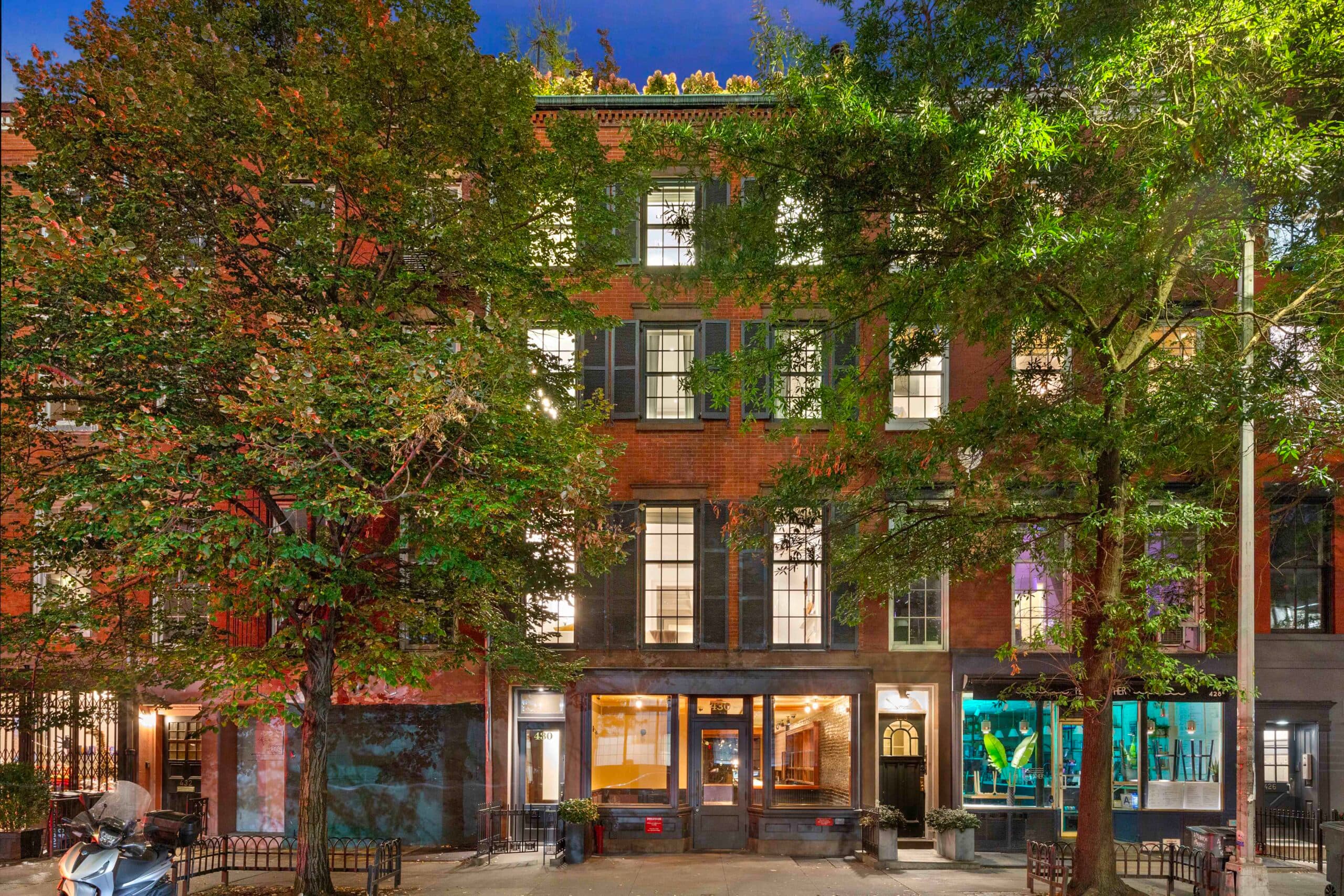 This rarely available property features a ground-floor commercial space, formerly occupied by restaurants Piora and Leroy House that includes two full cellar levels. The floors above feature a private, fully renovated residence with 4 bedrooms, 3 full bathrooms and 2 powder rooms, plus four fantastic outdoor spaces including the lush garden, three terraces, plus a rooftop deck with sweeping open views which include the Empire State Building and Freedom Tower.