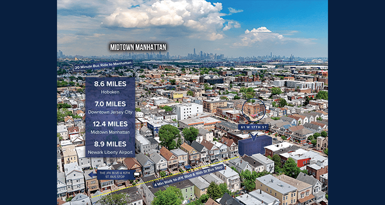 The building is a 4-minute walk from the JFK Blvd & 16th St. bus stop, offering direct access to the Journal Square PATH train and a 20-minute ride to Midtown Manhattan. It’s also an 11-minute walk to the 22nd St. Light Rail, conveniently connecting tenants to the rest of Hudson County and NYC