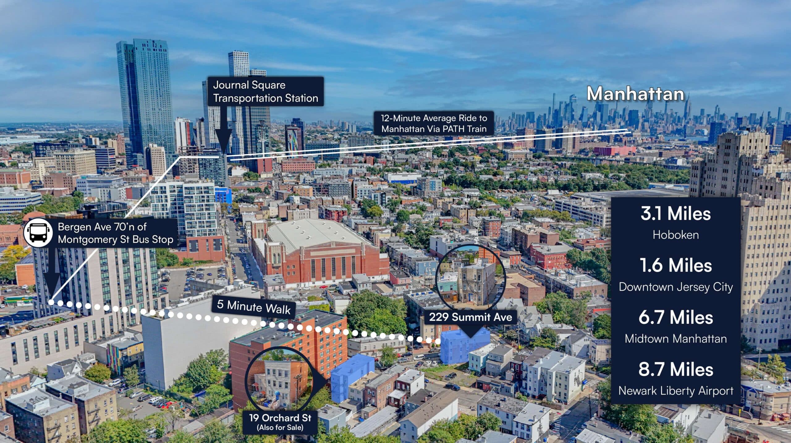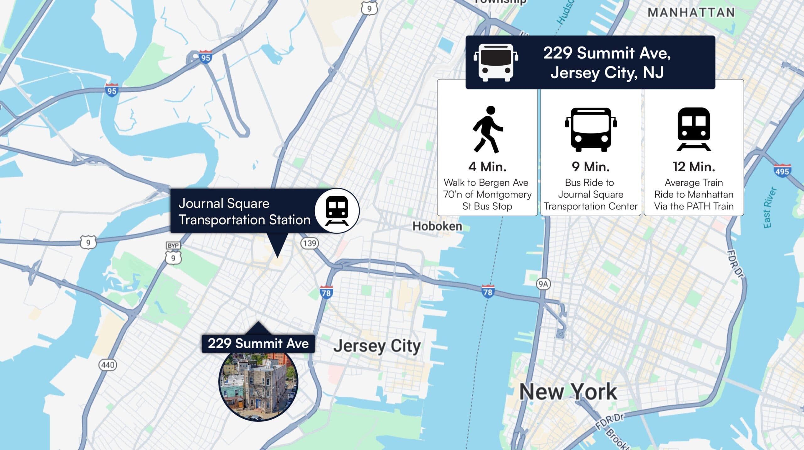 The building is approximately a 5-minute walk to Bergen Ave 70’n of Montgomery St bus stop which provides a 30 minute trip to Manhattan via the PATH Train.