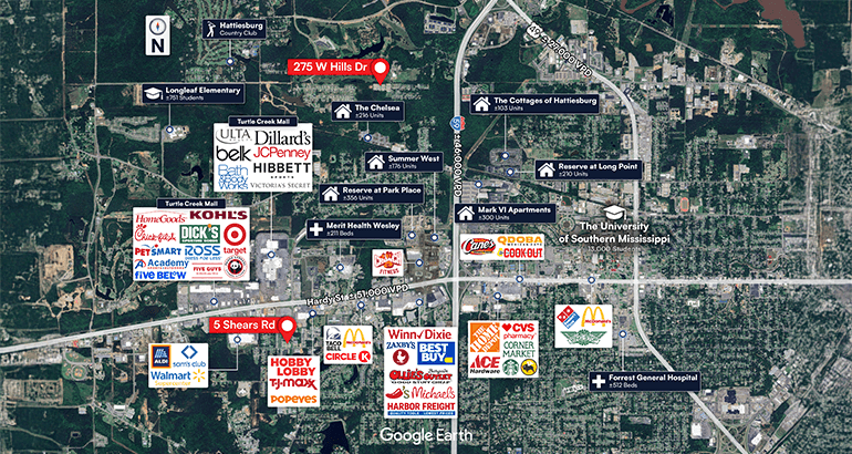 In the heart of Hattiesburg, down the street from the University of Southern Mississippi and major retailers including Walmart, Chick-Fil-A, Lowes, Hobby Lobby, etc.