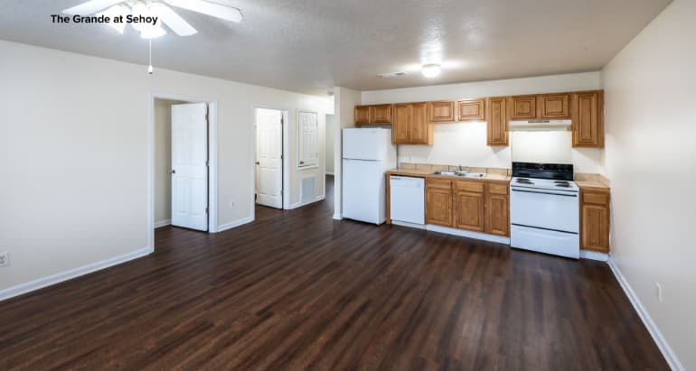 Renovated units feature carpet, vinyl, or stained concrete flooring, spacious closets, ceiling fans, and 9’ ceilings