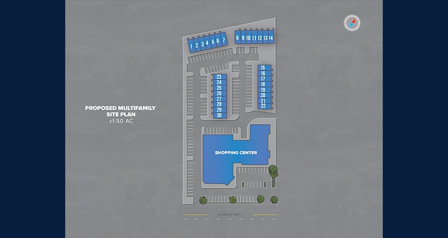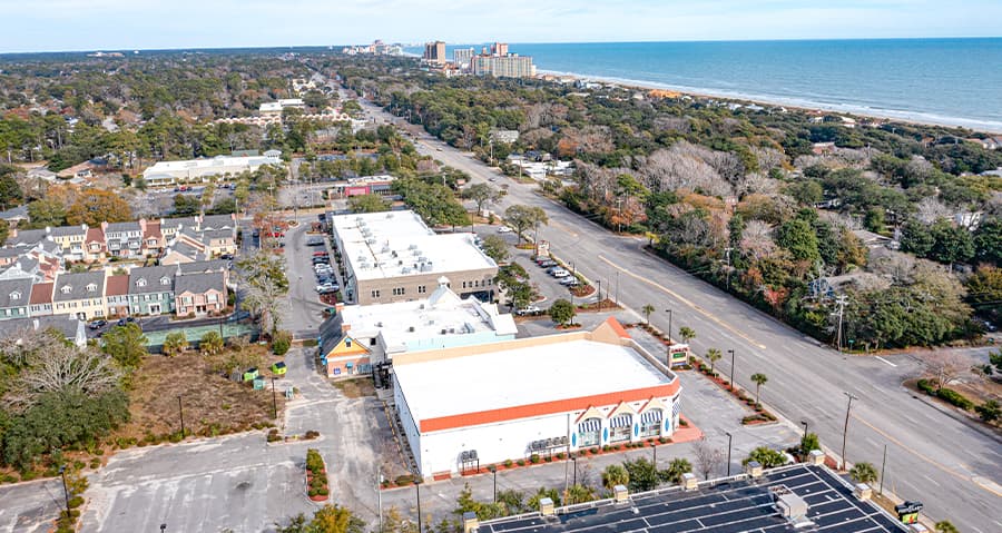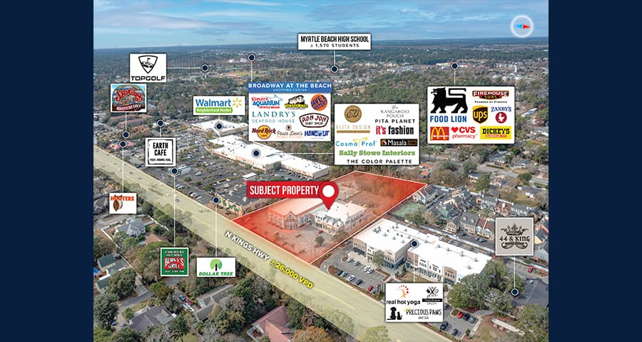 STRATEGIC LOCATION: Situated along N Kings Hwy (Highway-17 Business), the property is located in one of the most prominent retail areas in Myrtle Beach and sees over 26,000 vehicles per day. The center is adjacent to the Village Square Shopping Center, which includes a Walmart, as well as walking distance from the beach. This site is truly “Beach Real Estate” and is genuinely irreplaceable.