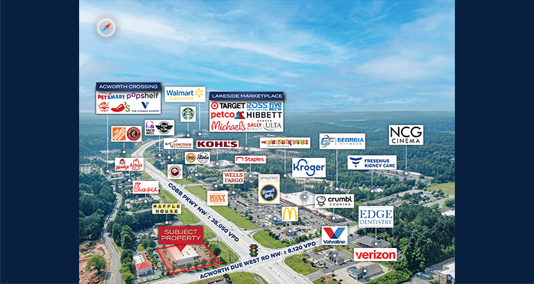 - Direct frontage along Cobb Parkway which is the main retail thoroughfare in Acworth and Kennesaw