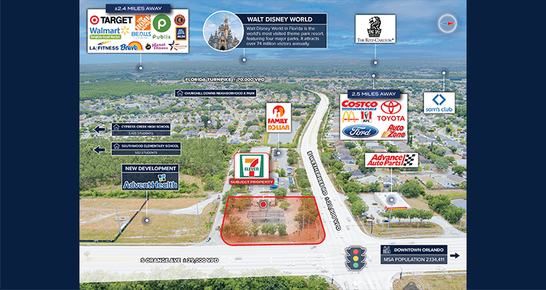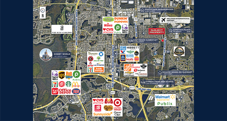 NEW DEVELOPMENTS AND NEARBY SYNERGY: This site is next door to a brand new Advent ER Facility development slated to be completed in Q4 of 2025, further confirming the growing immediate area. It also is nearby schools with over 5,000 students enrolled in just a 1 mile radius and has quick accessibility to Orlando International Airport.