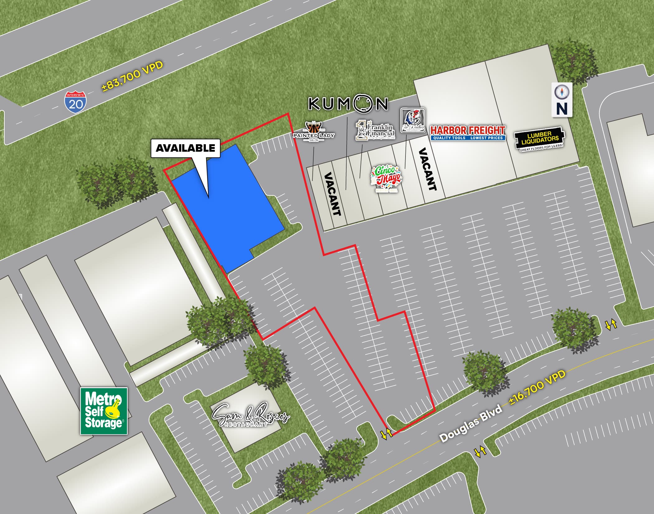 Positioned along Douglas Boulevard, the property enjoys prominent frontage and exposure to approximately 16,800 vehicles each day, enhancing tenant visibility.