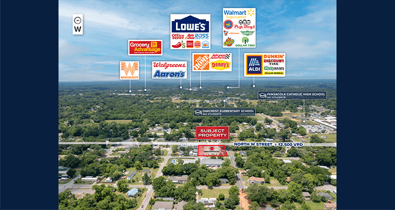 STRATEGIC LOCATION IN A GROWING MARKET – Pensacola is a growing metro in Florida with a strong local economy driven by tourism, a significant military presence, and a rising population. The property is situated adjacent to two schools, Pensacola Catholic High School and Oakcrest Elementary School, and benefits from excellent visibility, accessibility, and proximity to major traffic corridors.