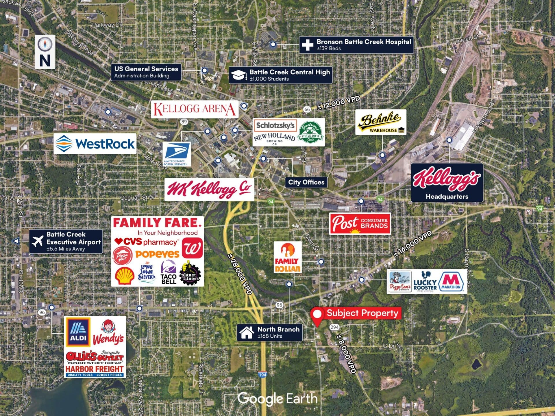 Proximity to Major Employers – Located minutes from Battle Creek’s major employment hubs, including Kellogg’s Corporate Headquarters, Bronson Battle Creek Hospital, and the W.K. Kellogg Airport industrial district.