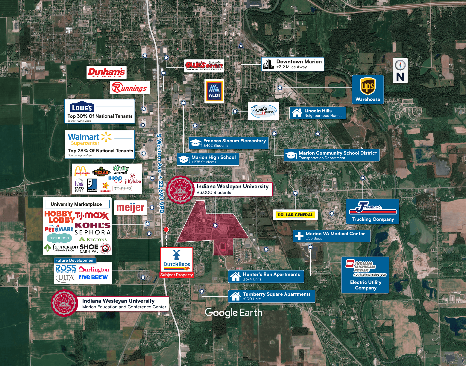 Immediate Proximity to Indiana Wesleyan University – The University has a total of ±14,500 students enrolled across its campuses, with ±3,000 enrolled at its main campus in Marion, which is walking distance to the Dutch Bros, supporting consistent demand from students, faculty, staff, and campus visitors. It is also less than a mile away from the University’s conference and events center, which brings an additional ±25,000 people in each summer.