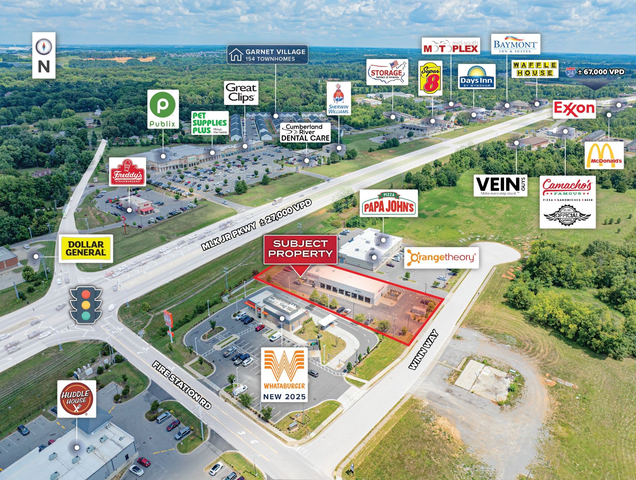 High traffic interstate location – Strategically positioned less than ½ mile from a full interchange with I-24 (+67,000 VPD), the primary thoroughfare connecting to Nashville, approximately 40 miles south.