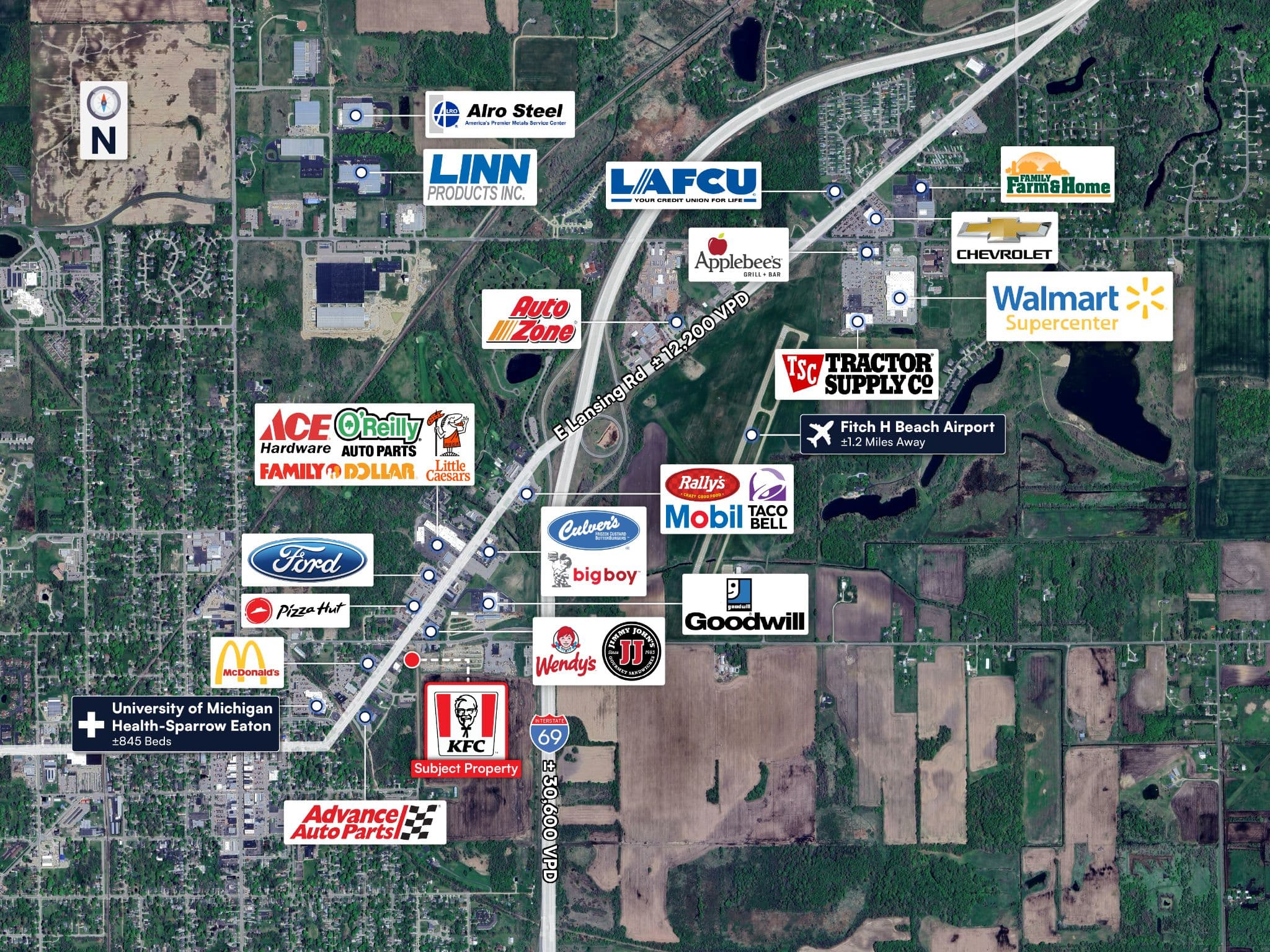 High-Visibility Location: The property offers prime placement along Lansing Street, Charlotte’s main retail corridor, with steady traffic and excellent accessibility. It sits just off I-69 (30,000+ VPD) and is positioned directly across from the 100,000 SF Eaton Hospital, alongside other established national retailers.