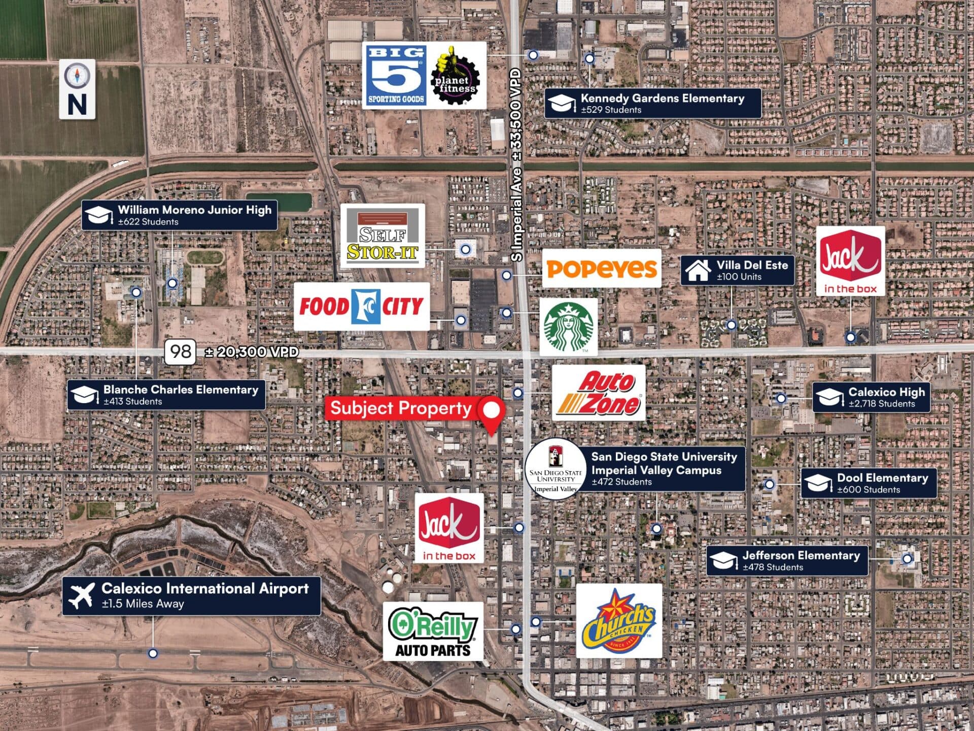 Excellent Visibility: Located at the corner of Emerson Ave and McKinley St, the property has visibility to over 20,000 vehicles daily and is located within a high-traffic commercial area in Calexico, California, near the U.S.-Mexico border, benefiting from significant cross-border commerce.