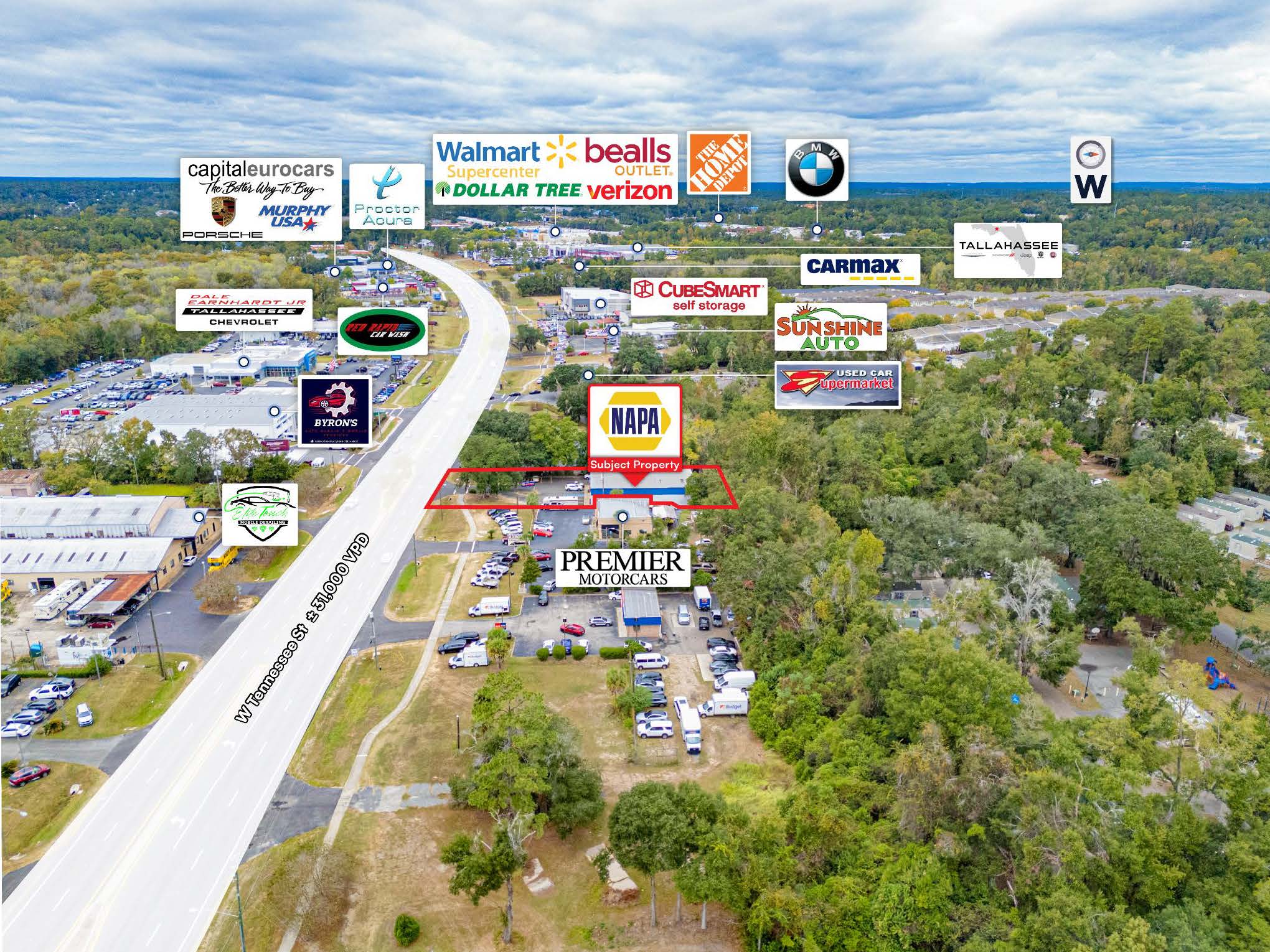 Strategic Automotive Corridor Location – Positioned within a high-traffic trade area surrounded by major national automotive dealerships—including Chevrolet, Chrysler, Mitsubishi, CarMax, Acura, Mercedes-Benz, Porsche, and Toyota—alongside complementary uses such as Red Rapid Car Wash, ensuring strong vehicular traffic and consumer draw.