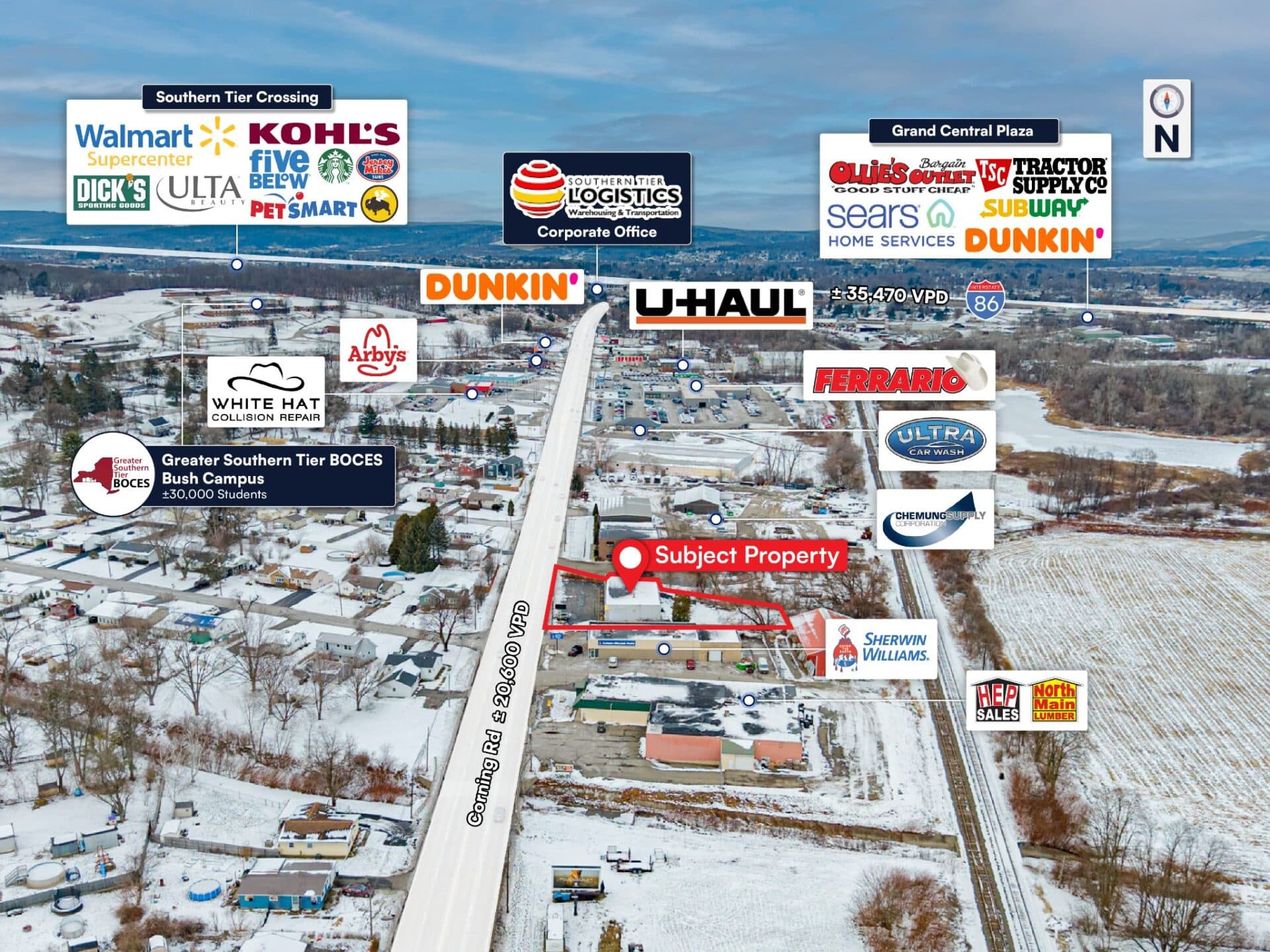 Strategic Corning Road Frontage – The asset is located along Corning Road, a high-visibility commercial artery linking Elmira and Horseheads. The location provides direct exposure to consistent vehicular traffic and benefits from ease of access to major regional thoroughfares, enhancing user convenience and branding potential.