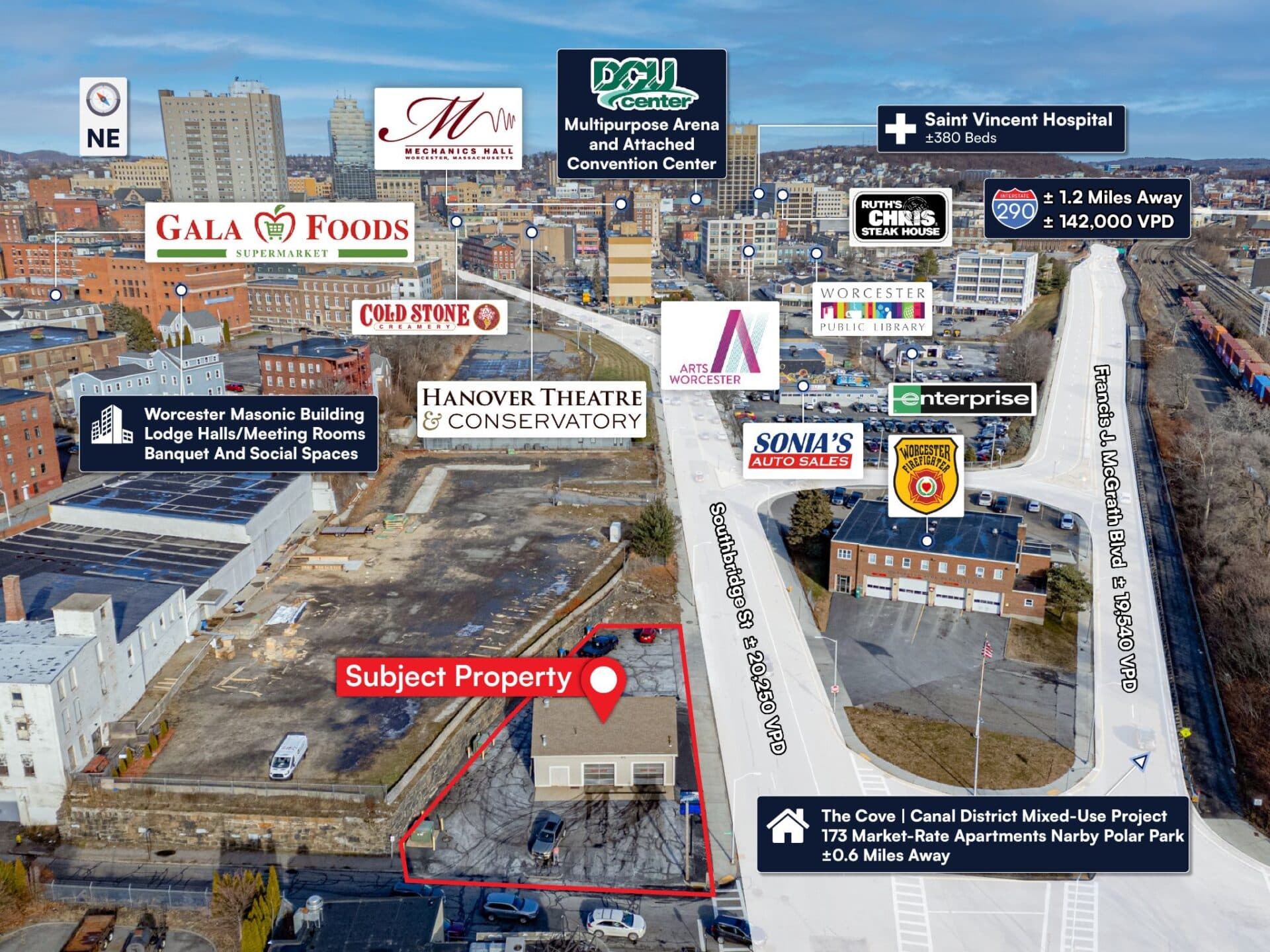 Prime Location With Strong Traffic Counts – Ideally positioned along Southbridge Street, a heavily traveled roadway providing direct access to Interstate‑290 and Route‑146, as well as Francis J. McGrath Boulevard, Main Street, and Downtown Worcester. Located less than one mile from the Downtown core, the property benefits from excellent frontage, easy accessibility, and consistent daily traffic to approximately 19,870 vehicles per day.