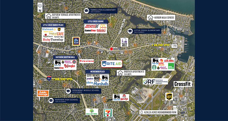 - Outparceled to Roosevelt Gardens Shopping Center (Tenants include Wells Fargo, Dunkin’ Donuts, Pizza Hut) (Corner of Halprin Drive and East Little Creek Road)