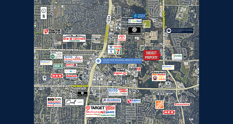 Located near Strong Retail Corridor | Notable nearby retailers under a mile include Walmart, The Home Depot, Whataburger, Schlotzsky’s, H-E-B, Firestone, Chick-Fil-A, Torchy’s Tacos, and many others.