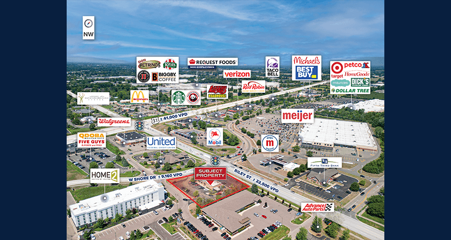 - Situated near the “Main and Main” of US-31 and Riley St, directly across from Meijer, with combined traffic counts exceeding 55,000 vehicles per day.